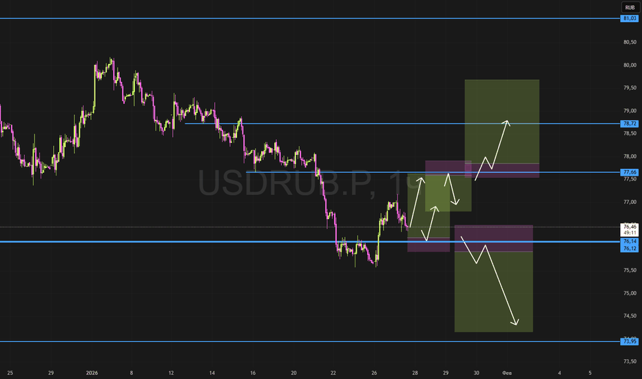 #USDRUB попытка закрепиться выше 76.С прошлого обзора RUS:USDRUB.P отмечал коридор по графику от 76 до 81, прошло немного времени, цена достигла нижней границы. Но была попытка пройти 76.12. Я пока нейтрально рассматриваю график, причин для покупок мало, сейчас распишу: