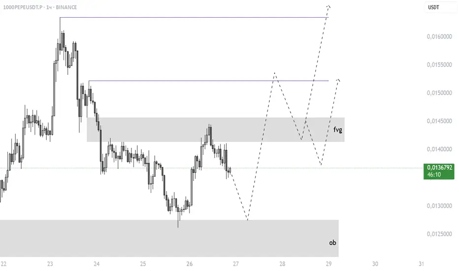 Текущая структура на графике 1000PEPEUSDT указывает на завершение фазы коррекции и формирование сценария возврата к ключевой области дисбаланса — FVG. Цена находится в фазе локального снижения, но без обновления предыдущего экстремума, что формирует предпосылки для финального сброса ликвидности в сторону OB.