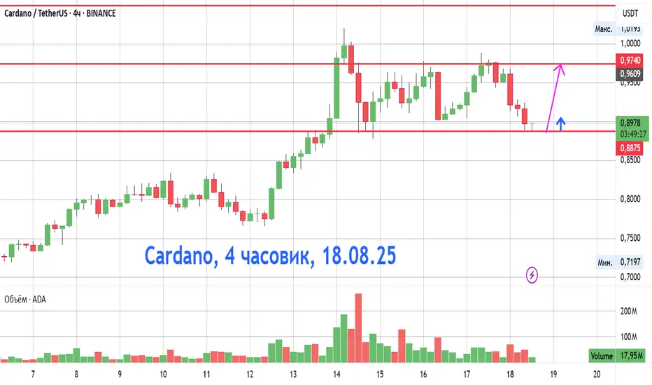 Монета Кардано, ADA-USDT, 4 часовик, лонг от уровня 0.8875 Ордер стоп-лосс под уровень по своим рискам, первая цель - 0.9740, вторая цель - посмотрим дальше.