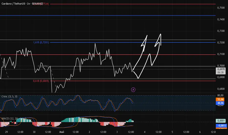 Взглянем на Cardano с точки зрения внутридневной торговли. На часовом графике текущая цена — 0.6959 USDT, после незначительного отката от 0.7100. По волновому анализу мы завершаем коррекцию, и вполне вероятен рост к уровню 0.7200, что может стать целью 5-й волны. Уровни Фибоначчи подтверждают ключевые зоны для покупки: 0.618 и 0.786.