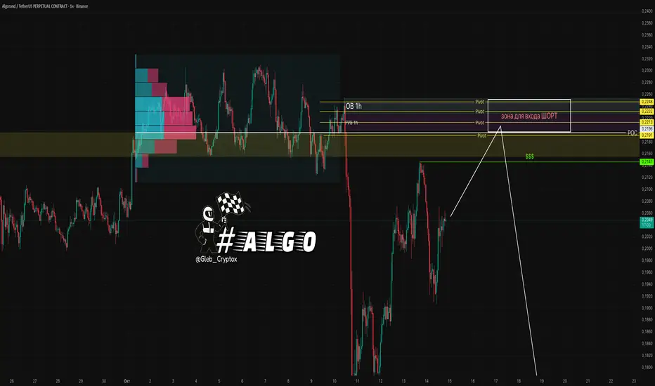 После импульсного падения цена формирует коррекцию, направленную к зоне интереса продавцов. В этой области совпадают ордер-блок, неотработанный FVG и кластеры Pivot-уровней, усиливающие вероятность реакции. Основной сценарий — доставка цены в диапазон входа и возобновление нисходящего импульса.