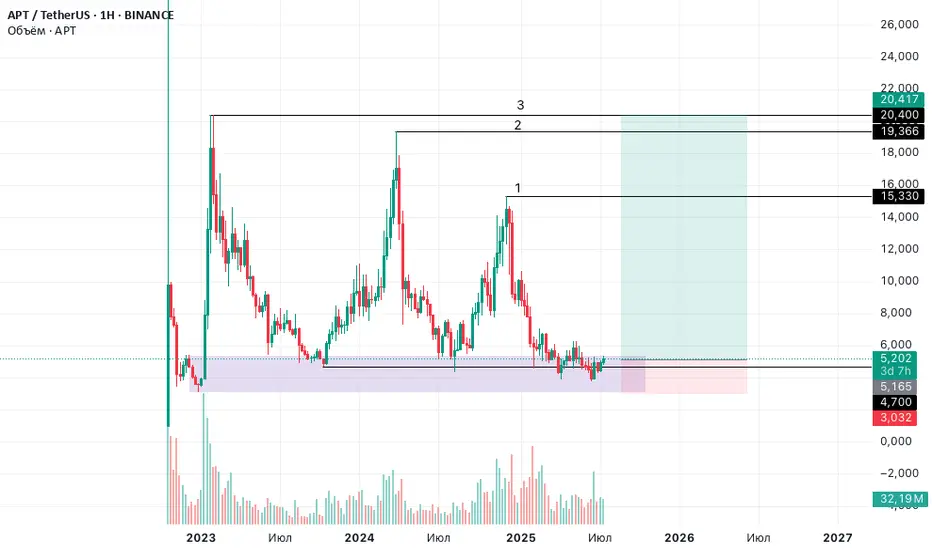 Аптос довольно бодро влетел в свое время в рынок и целых три раза давал забрать профит 400%, 300% и 250%. Хайп по проекту утих, все забыли про аптос, а он тем времен сформировал хороший диапазон поддержки и сейчас формирует в этом диапазоне локальное накопление.