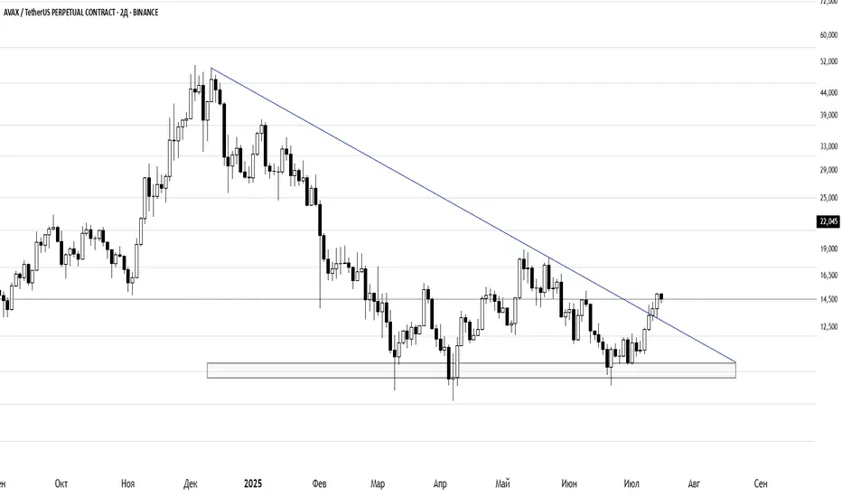 На 2-дневном графике Avalanche наблюдается чистый пробой нисходящей тренд-линии, которая сжимала цену ещё с ноября. Свеча уверено закрылась выше, сейчас AVAX консолидируется у $22–23.