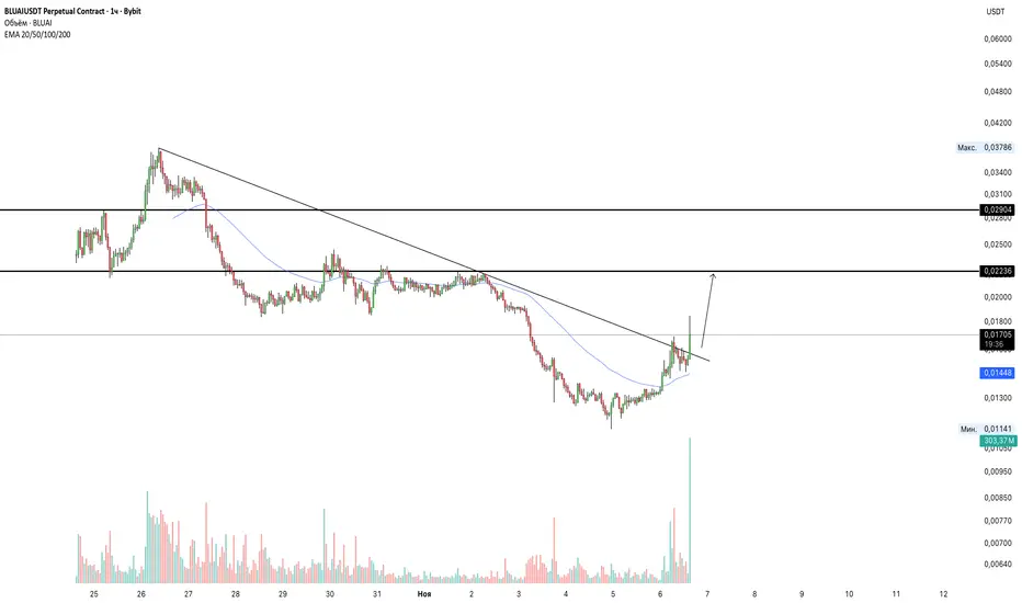 На графике наблюдается пробой нисходящей трендовой линии, который сопровождался существенным увеличением торгового объема, что усиливает сигнал о возможной смене локального тренда. Цена закрепляется выше уровня краткосрочного сопротивления