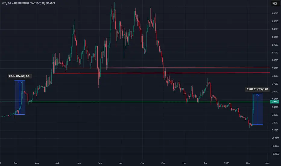 Теперь заглянем в историю: в 2024 году BNX уже показывал бычий забег с $0.29 до $1.50, после чего последовало -83% и 160 дней падения. Сейчас же покупатели возвращаются, что подтверждает 8-миллиардный объем на фьючерсах.