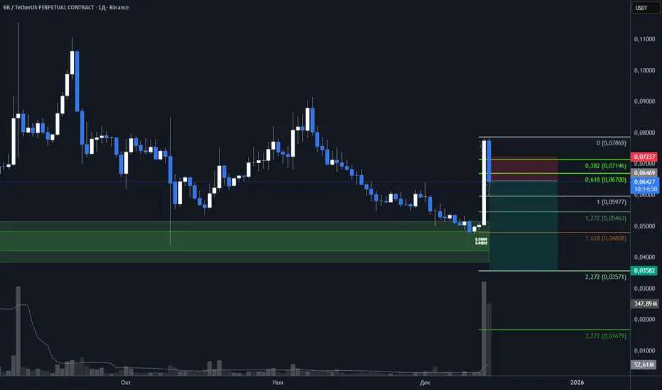 - Условие входа: Цена подходит к уровню сопротивления 0,06700 или 0,07146 и начинает формировать разворот (например, свеча с длинным верхним фитилём, медвежье поглощение).