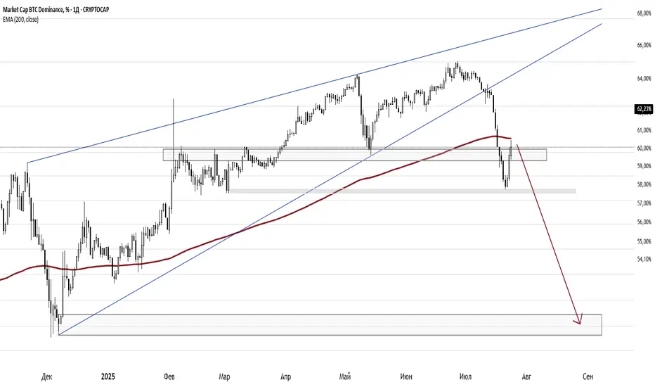 На дневном графике BTC Dominance (%) наблюдается жёсткий слив из многомесячного восходящего клина.