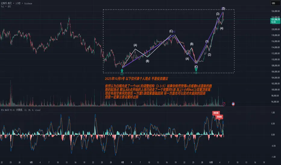 依然认为白框内走了一个ABC的调整结构(3-3-5)如果你依然觉得A点或者B点是新的趋势的起涨点 那么从B点开始的上涨已经走了一个完整的5浪 加上1小时MACD双重顶背离 现在布局空单风险很低 一方面5浪结束面临回调 另一方面也可以应对大级别的回调 但是一定要注意设置好止损