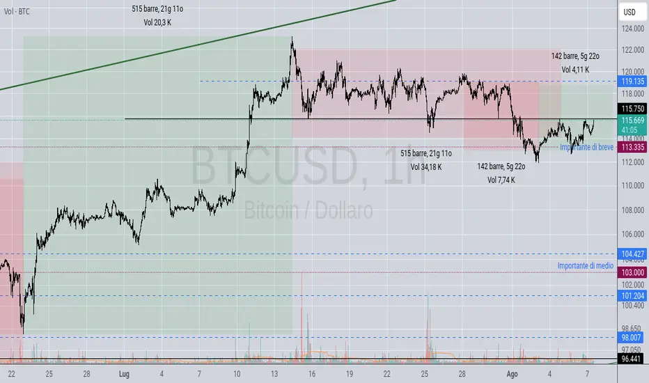 Per superare il massimo storico serve molta forza rialzista, di solito ad Agosto non è così inoltre la spinta sembra affievolirsi da un mese, anche se domani Trump farà il solito annuncio che i tassi verranno tagliati, che Powell è un incompetente(nel frattempo nonostante siano più colombe che falchi, vanno lo stesso dietro al capo) e piazzerà una sua pedina nel board. Potremmo assistere a un movimento al rialzo abbastanza forte, però il mercato sta già scontando due tagli da 0.25, ovvero ciò che risulta a tutti gli operatori che osservano costantemente la FED. L'unica sorpresa potrebbero essere più tagli o meno tagli, perciò il mercato al momento non ha quella forza che ha contraddistinto tutti i bull market passati delle cripto. Il dato dell'inflazione forse farà da pivot per poi andare a prendere anche i margini dei long, che nel frattempo si stanno accumulando da 111k usd in su'. La poca liquidità consente questa caccia al margine, di movimenti importanti per adesso non se ne vedono, i livelli che ho etichettato rimangono quelli, aggiungo solo la mia ipotesi sul breve periodo. Se invece di andare su' andasse a rompere i 111k usd, le liquidazioni dei long arriverebbero a cascata generando il panico, ergo un movimento pesante fino ai 103k circa. Sono ipotesi, magari domani lo scenario potrebbe cambiare, attualmente il grafico dice questo e gli eventi programmati sono già scontati dal mercato, perciò piazzate sempre i take profit e gli stop loss, i cambiamenti improvvisi non si possono prevedere.