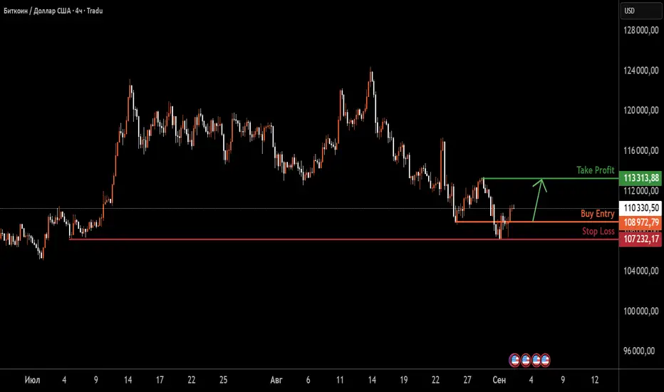 Вход на покупку находится на уровне 108 972,79, что является уровнем поддержки отката.