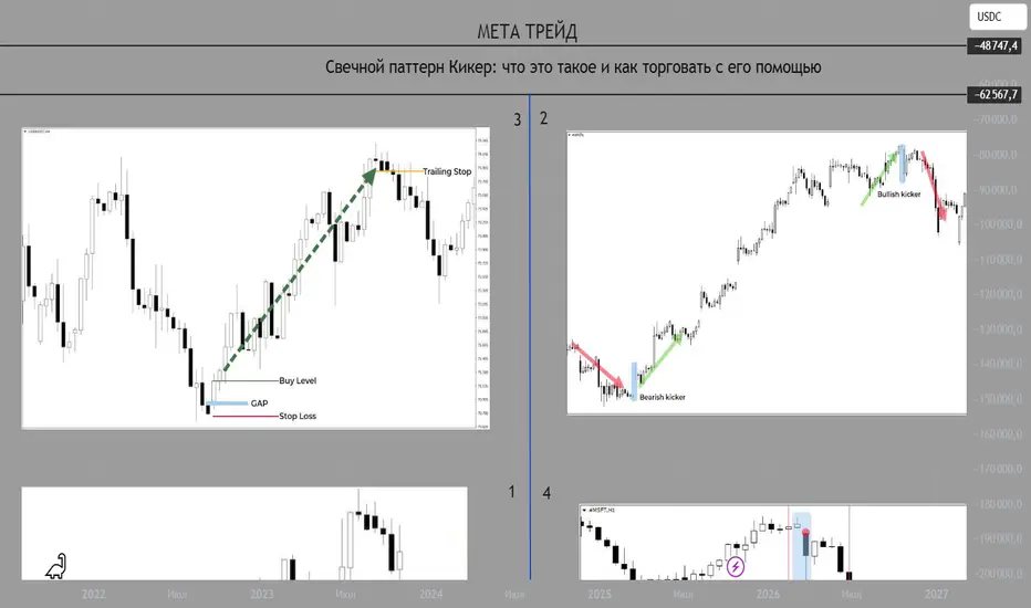 Визуально Кикер — это фигура свечного анализа рынка, которая появляется на графиках цены после стабильного восходящего или нисходящего тренда, указывающая на изменения рыночных настроений и предвещающая разворот тренда.