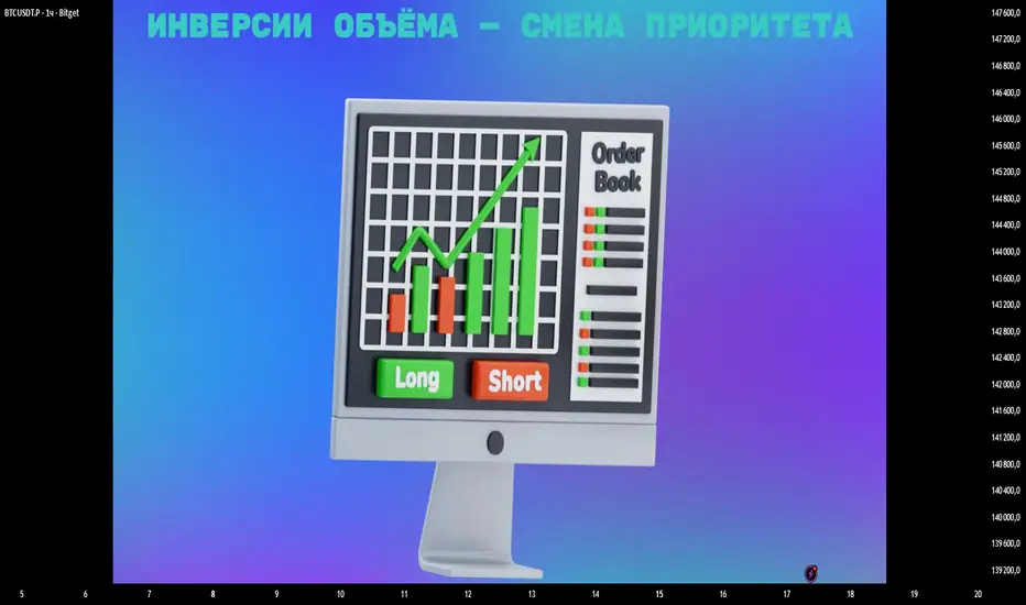 Инверсия — это момент, когда новый объём появляется не в сторону предыдущего импульса, а против него. При этом старые зоны объёма теряют силу, а цена закрепляется под/над ними. Это разворотный сигнал.