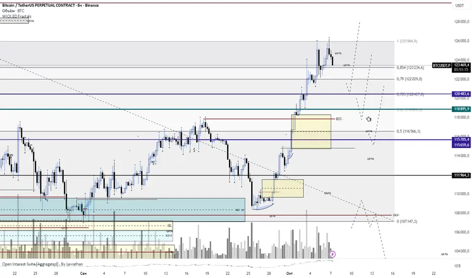 Мы отметку 126 000$ “заколотили”, но волна не обновлена — сила слабая. Из-за перекупленности потребуется уверенная проторговка выше ~124 000,плюс активность покупок чтобы продолжить рост. Иначе снижение, скорее всего — в рамках коррекции, если удержаться не удастся