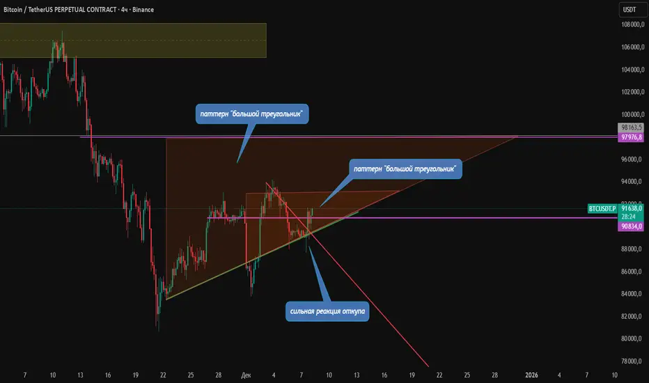 Рассматриваю движение биткоина в двух восходящих паттернах: большой треугольник и малый треугольник.