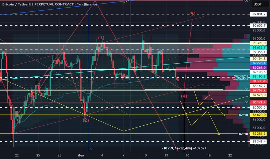 11. Волновая теория Эллиотта. Если смотреть на четырёхчасовом графике, то можно увидеть пятиволновик восходящий, который уже отрисован, сейчас мы с вами начали рисовать корректирующие волны ABC. В процессе отрисовки волны A, если смотреть по подволнам, мы отрисовали волну 1, 2, теперь нужно рисовать третью подволну в A, затем отскок — четвёртая волна, и потом уже пятая волна, минимальная цель была 89.100, мы уже её забрали. На дневном графике у нас флаг, и этот флаг является четвёртой волной, фигуры продолжения зачастую именно в четвёртой волне и появляются, следовательно, на данный момент я бы рассматривал отрисовку волны 5, а потом уже начало отрисовки волны B вверх.