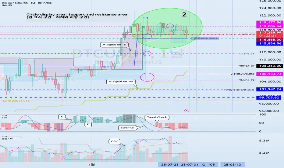 115854.56 이하로 하락하게 되면, 1W 차트의 M-Signal 지표를 만나면서 다시 추세를 결정할 것으로 예상됩니다.