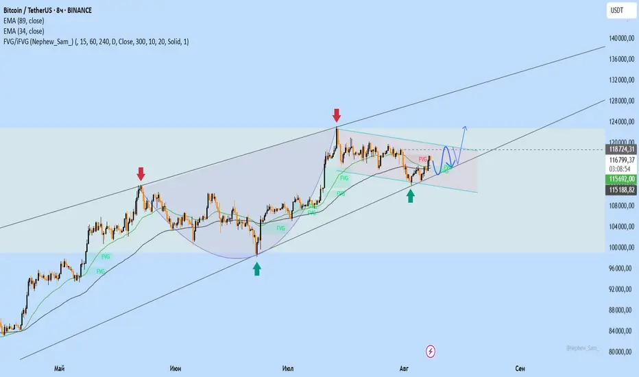 BTCUSDT продолжает торговаться внутри крупного восходящего канала, формируя последовательную структуру higher low, при этом EMA 34–89 выполняют роль важной динамической поддержки. После фазы коррекции в модели нисходящего клина цена отскочила от ближайшей зоны поддержки и движется к верхней границе сопротивления.