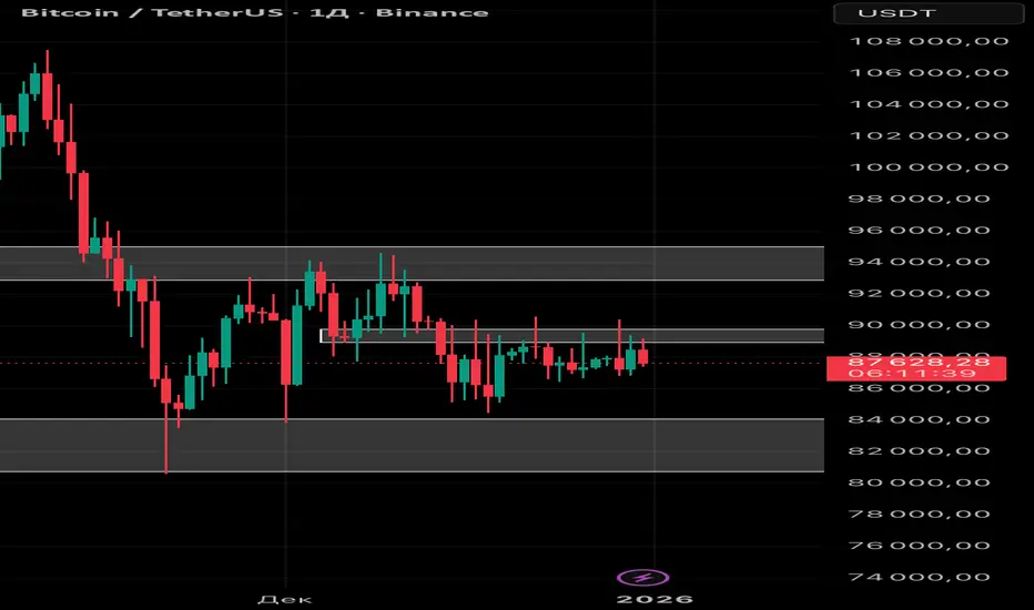 Биткоин под Новый год продолжает накапливать объёмы у верхней границы консолидации, буквально дыша в спину сопротивлению в районе $90.000.