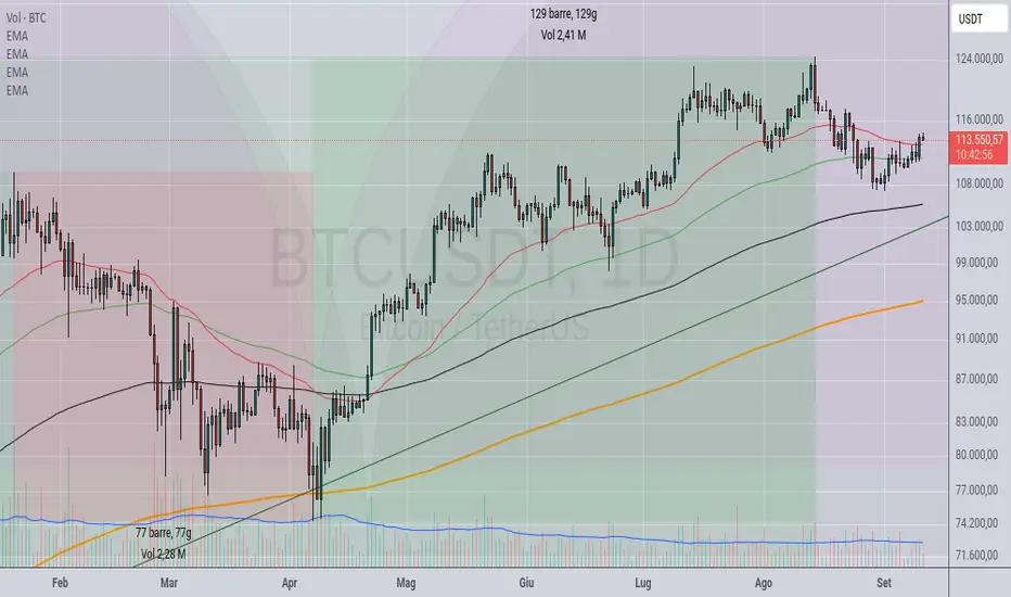 Non vi ho mai fatto vedere le mie medie mobili esponenziali che utilizzo. Sono configurate sui cicli estrapolati dai movimenti del prezzo del bitcoin, la configurazione non è statica ma variabile. So che nell'epoca delle intelligenze artificiali, degli algoritmi, io risulti una specie di dinosauro a usare il metodo discrezionale, però quando tutti utilizzano lo stesso metodo non va mai a finire bene. Certo la vostra equity line è bella da vedere in momenti come questo, ma basta un trade sbagliato o un cigno nero e il vostro algoritmo verrà ammazzato insieme all'intelligenza artificiale che vi dirà :"Ho sbagliato non era short ma era long!". Comunque vi elenco i periodi, sia mai che qualcuno possa avere beneficio da questa idea: