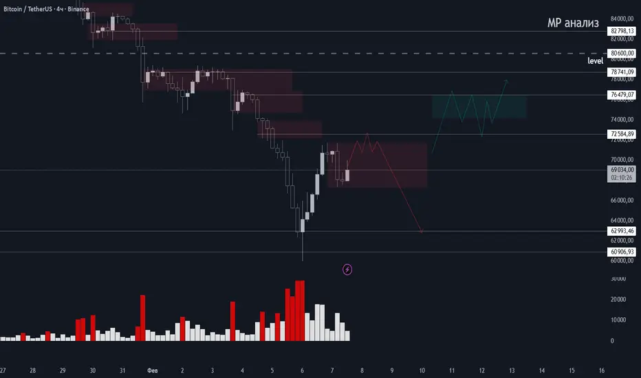 Тренд медвежий — это видят все, но большинство хочет открыть шорты с премиум зоны (76к-86к) и по текущим вход мало кто будет искать. Исходя из этого важно найти точку входа в шорт либо с текущих - либо искать продолжение в лонг