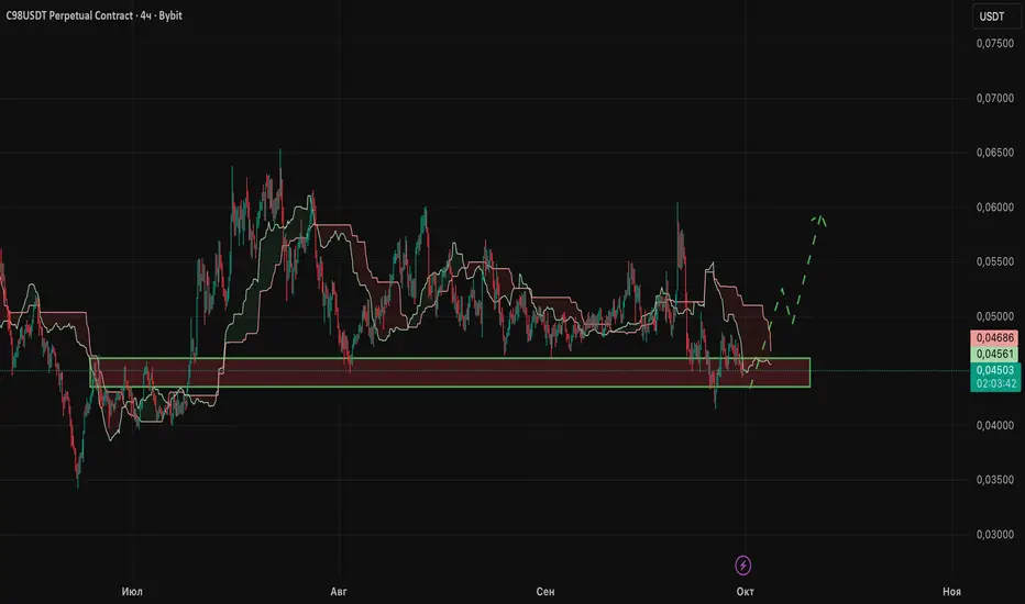 Актив торгуется в рамках боковика 0.04015$ - 0.06228$, который вероятнее всего расторгуется в лонг, учитывая возвращение положительной динамики на рынок.