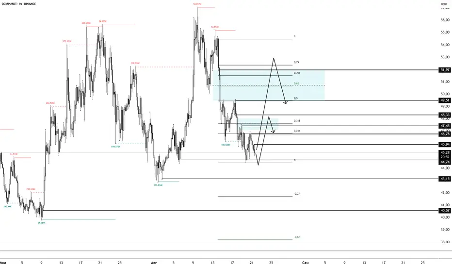 В случае если цену уронять с текущих, можно понаблюдать за реакцией после снятия лоев в районе 43-45$ где после проторговки ожидаю увидеть рост.