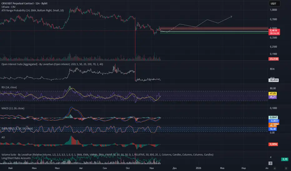 После сильного обвала цена CRV/USDT консолидируется в узком диапазоне около $0.46. На графике видно, что цена пытается удержаться над локальной зоной поддержки ($0.42–$0.44), где ранее наблюдался всплеск объёмов, что указывает на возможное накопление.