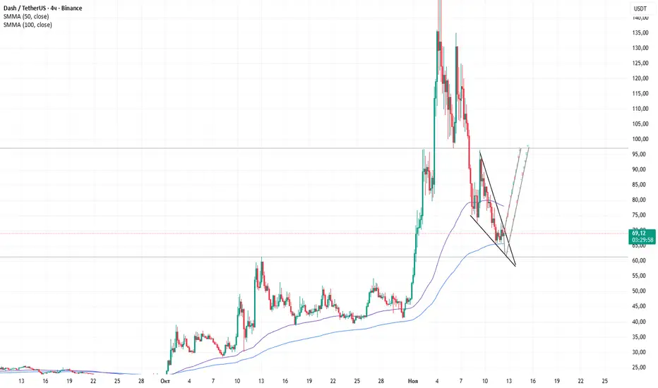 От текущей цены можно набирать позицию с целью отскока к зеркальному к уровню 97$.