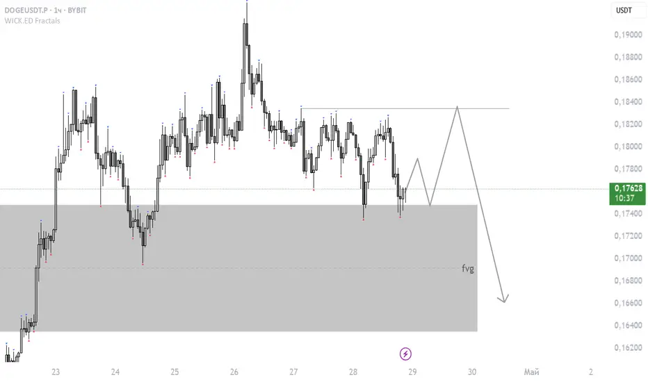 Цена удерживается в пределах сформированной зоны FVG. Пока сохраняется локальная поддержка, возможна попытка отскока к 0,182–0,184. Однако основным сценарием остаётся шорт в случае формирования паттерна разворота.