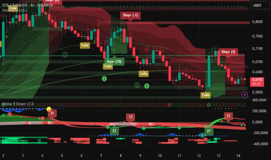 Свечной паттерн — это прям драма: мелкие свечи с тенями, рынок в раздумьях, куда рвануть! 🤔 Индикатор MIDAS ("Down 17.3") кричит: "Медведи рулят!" 🐻