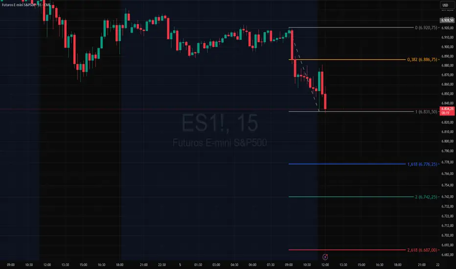 No gráfico de 5 minutos do ES1!, rompeu um pivô de baixa indicando a busca do(s) alvo(s) da projeção de Fibonacci, poderá retrair gerando um trade com retorno/risco mais favorável.
