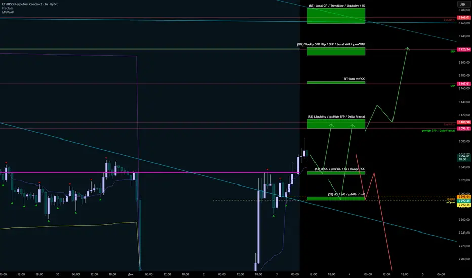 Ефир хоть и быкует тоже, но не выглядит так уверенно как биток. pwHigh + Дневной свинг на 3100 всё еще стоит. Если его снимет и закрепится в ближайшее время, то лой на 2700 уже не должен обновляться, т.к. структура HTF уже будет бычьей. Пока что ефир пришел в середину диапазона ~2800-~3200. В случае закрепа ценой на MTF выше 3100 буду ловить лонги до 3200. От 3200 мб поищу шорт в рамках диапазона с целями 3100>3000 если дадут конфирмы на шорт.