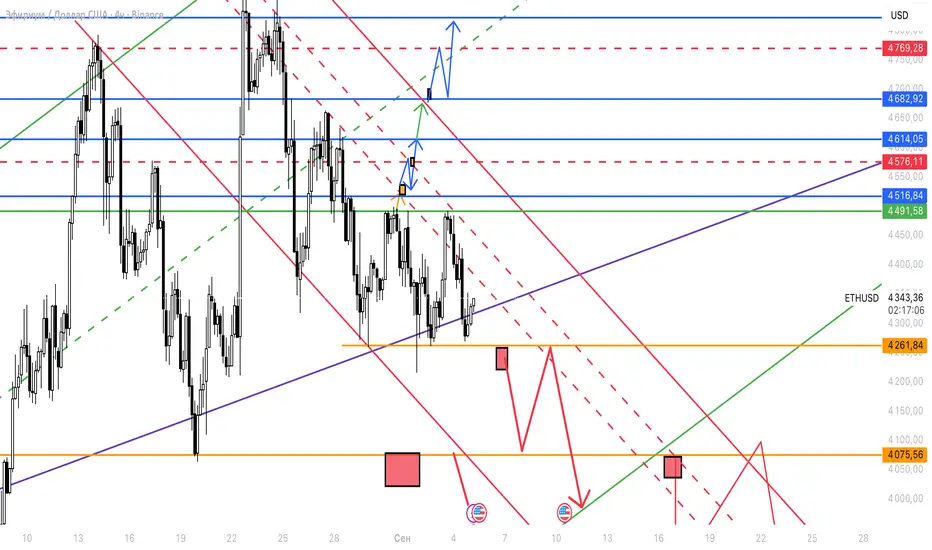 Данная инновационная идея создана с целью показать, как я вижу развитие движения цены по построенным трендовым линиям и ключевым уровням.