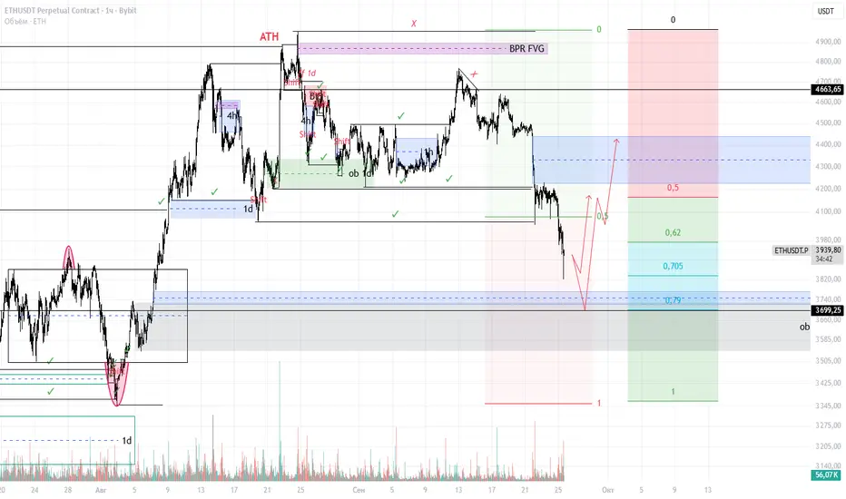 2️⃣ Более глубокая коррекция — возврат к зоне ордер блока в районе 3700$, и уже оттуда продолжение движения в лонг.
