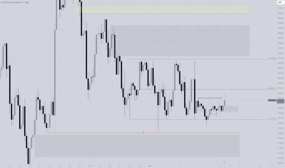В районе 4500$ есть полка, чуть выше здоровенная зона интереса, которая выступает целью. Это может послужить лонговым тейком, я бы назвал диапазон 4560 - 4640$. Самый оптимистичный вариант, где собрано очень и очень много ликвидации плечистых - это 4660$.