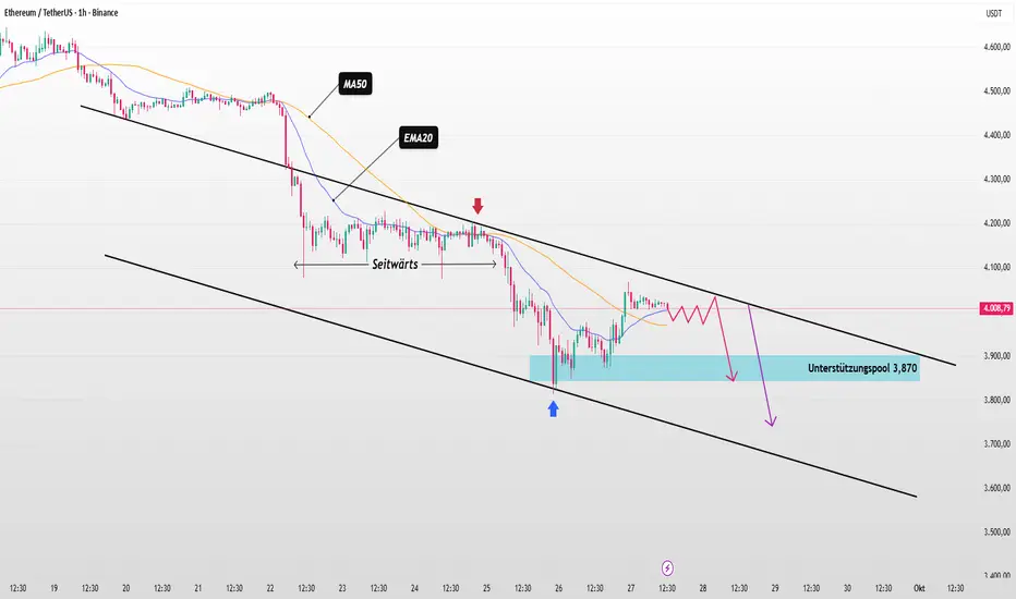 In diesem Szenario ist der Abwärtstrend weiterhin dominant. Glauben Sie, dass ETH/USDT 3.870 halten kann oder wird dies nur ein kurzfristiger Stopp vor einem stärkeren Rückgang sein?