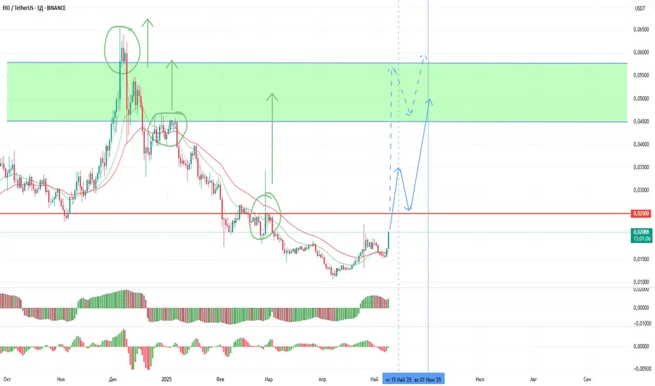 Сегодня продолжает ускорять рост и fio, которую я рассматривал к работе в первую очередь. Основной целью является ретест ключевого уровня 0.025, который откроет дорогу вплоть до 0.50-75. Повторный пробой и закрепление выше можем увидеть уже сегодня. При открытии второй половины месяца выше уровня к июню fio может перейти в диапазон 0.045-60. При достаточной волатильности тест этого диапазона вероятен и завтра.