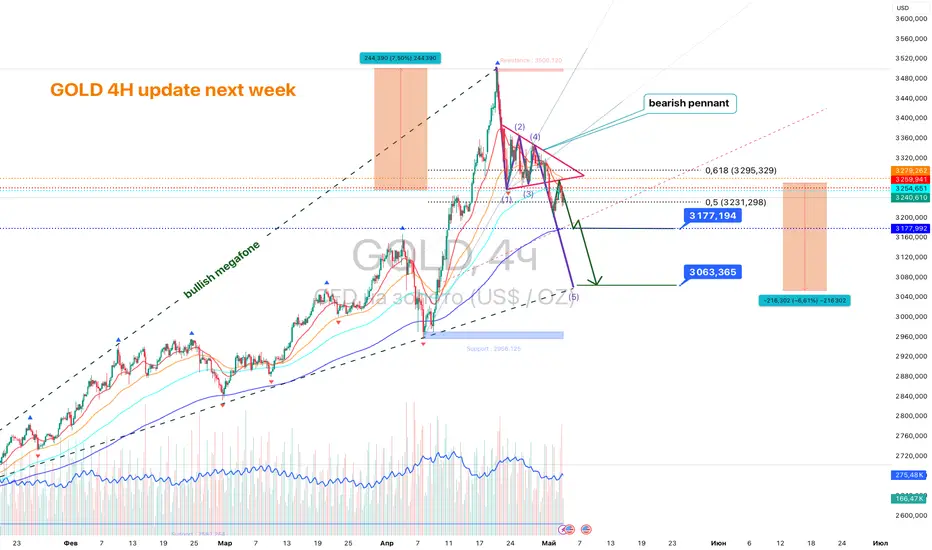 После пробоя фигуры консолидации золото формирует нисходящее движение с прицелом на зоны поддержки $3177 и $3063. Медвежий сценарий подтверждён технически — пока цена остаётся ниже $3295, давление вниз сохраняется. Однако движение происходит внутри “бычьего мегафона”, что требует внимательного наблюдения за дальнейшим развитием событий.