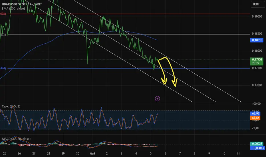 На часовом графике HBAR складывается всё больше сигналов в пользу продолжения нисходящего движения. Текущая цена — 0.17700 USDT, и в целом рынок пока не показывает признаков разворота. Напротив — всё указывает на то, что медведи ещё не сказали последнего слова.
