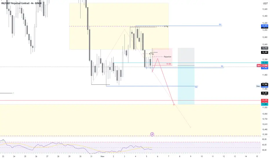После манипуляции внутри 4H Fair Value Gap (FVG) жду закрытия 4-часовой свечи и формирования Order Block (OB) на стыке 4H и 1H таймфреймов. Это будет моей (POI), где буду анализировать ценообразование на предмет появления шортовой модели. В качестве цели рассматриваю 1D Buy Side Imbalance/Sell Side Inefficiency (BISI).