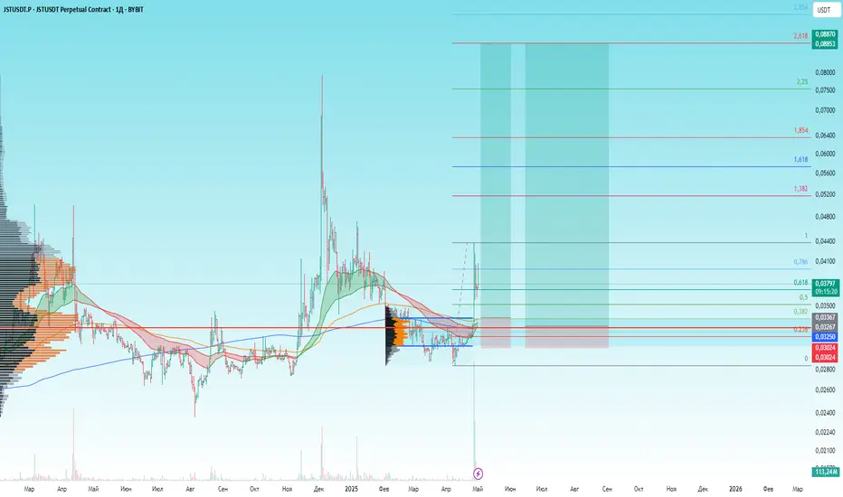JSTUSDT: «После длительного накопления в 3 месяца цена вырвалась и сломала нисходящую тенденцию, при коррекции в зону стоимости 0,03365–0,03050 буду набирать лонги от уровней 0,03365 – VAH; 0,03270 – POC».