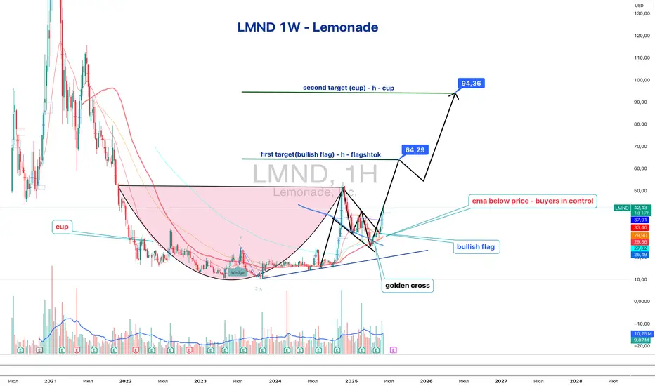 Lemonade Inc. (LMND) уверенно развивает импульс после пробоя модели чашка с ручкой, где «ручка» оформилась в виде сжатого бычьего флага. Пробой произошёл в районе $32, и с тех пор актив набирает обороты без значимых коррекций — цена уже в зоне $42.42, демонстрируя сильную динамику в рамках подтверждённого тренда.
