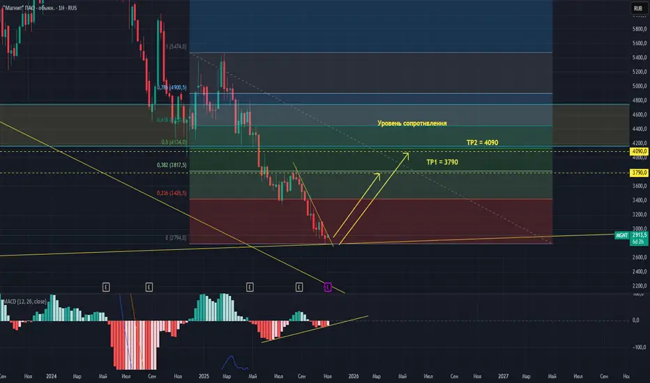 Цена на акции Магнит долгое время снижалась и сейчас подошла к линии тренда на месячном графике. Перепроданность по многим тех. индикаторам. Я считаю, что можно ожидать как минимум коррекционного движения до ближайшего уровня сопротивления. Если смотреть на месячный недельный графики сильным сопротивлением выступает уровень 4150-4750. Итак: