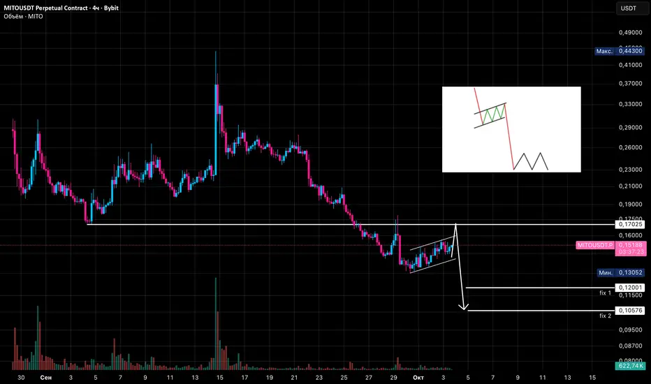 Монета смотрит вниз и формирует «медвежий флаг», #mito как и большинство новых активов, которые уже отработали или отрабатывают этот паттерн.