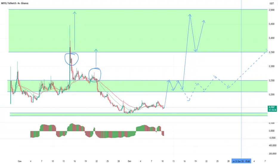 В первую очередь рассмотрю более надежные варианты для работы в среднесрок, где можно держать позицию с нынешних уровней и доливать в случае теста более низкой поддержки при падающем рынке, такие как MITO VIC HOOK BMT. В этом обзоре уделю внимание MITO, который может повторить картину STO уже в этом месяце. При нынешней эмиссии основной поддержкой является диапазон 0.125-35, ниже которого падение возможно только при просадке ETH до 3500-3750, что создаст хорошую возможность для дополнительного уверенного заработка. На этой неделе по ETH был повторно пробит уровень 4750, что является сигналом на повторную попытку пробоя 5000. Более вероятно, что эта попытка будет предпринята уже в следующем месяце. Однако снижение угрозы дальнейшего падения эфира уже дает повод для покупок по MITO. И так покупки можно держать уже с нынешних уровней, т.к. прошел отскок от основной поддержки. При оптимистичном сценарии резкий рост может начаться уже с этих выходных с закрытием недельной свечи бычьей и продолжением тренда на новой неделе. Ближайшей целью является возврат к сопротивлению в диапазоне 0.21-25, после переторговки в котором откроется возможность для теста 0.35-50. Этот диапазон при нынешней эмиссии является основной целью. При негативной динамике ETH есть вероятность снижения темпов роста. В таком случае от 0.25 мы можем увидеть значительный откат с продолжением тренда уже после открытия новой месячной свечи выше 0.21.