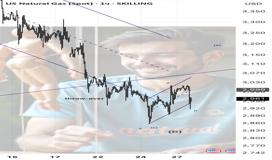 Выброс ниже часового параллельного канала это либо формирование субминуэтной волны b в цикличной волне (С), либо завершающая структура цикличной волны (В). Если это выброс за пределы канала , то цена вернется в канал и протестирует верхнюю трендовую линию часового канала 3.052. Если не закрепится в пределах канала - значит газ ожидает еще одна волна снижения , минимально равная размерности параллельного канала .