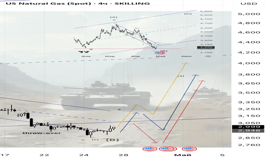 Вариант 3 (красная стрелка): отскок от параллельного канала 3.066 и пробой 2.858 минимума 24 апреля и дальнейшее развитие цикличной волны (В).
