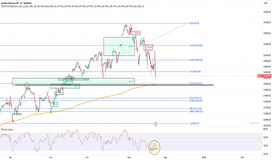 Цена достигла месячного FVG. Может ещё дотянуться до 100-дневной скользящей (на US100 уже дотянулась, но на NDX она немного ниже, на этом графике её нет), а также до 0.618 фибы от дна 1 августа до вершины, до VWAP от дна конца июня (жёлтая линия) и оттестировать пик 13 августа.