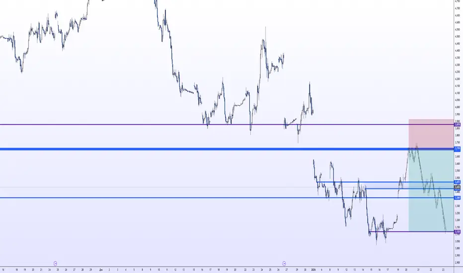 📣 Всем доброго дня🤝 Начнем мы новую торговую неделю с анализа фьючерсного контракта на природный газ. Цена актива пришла в область ключевого недельного сопротивления 3.423 - 3.472. Среднесрочная тенденция актива нисходящая, поэтому в приоритете следует рассматривать вход в короткие позиции. Текущее сопротивление уже ретестировалось ценой, что более отчетливо видно на международной бирже NYMEX. В связи с чем есть высокая вероятность продолжения текущего коррекционного движения, целью которого будет являться аномальное недельное сопротивление в районе ценовой отметки 3.710. Здесь же мы и будем рассматривать вход в короткую позицию, заранее разместив лимитный ордер на продажу. Стоп лосс, по правилам торговой системы, мы размещаем за следующим дневным уровнем сопротивления 3.878 с запасом.