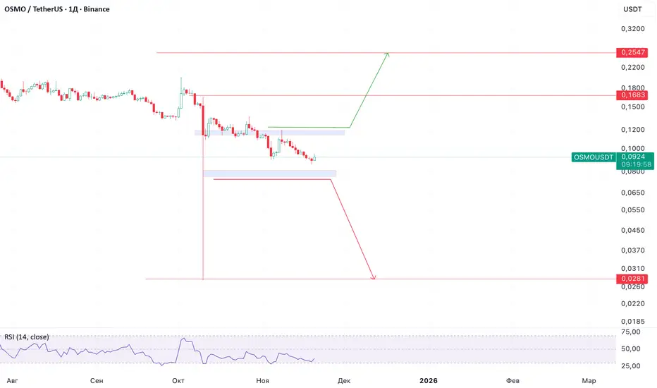 Поддержка находиться в диапазоне от 0.0767 до 0.0808 отработка и фиксация стоимости ниже данного уровня, может привести к ретесту ATL тени от 10 октября 2025 года к значению 0.0280